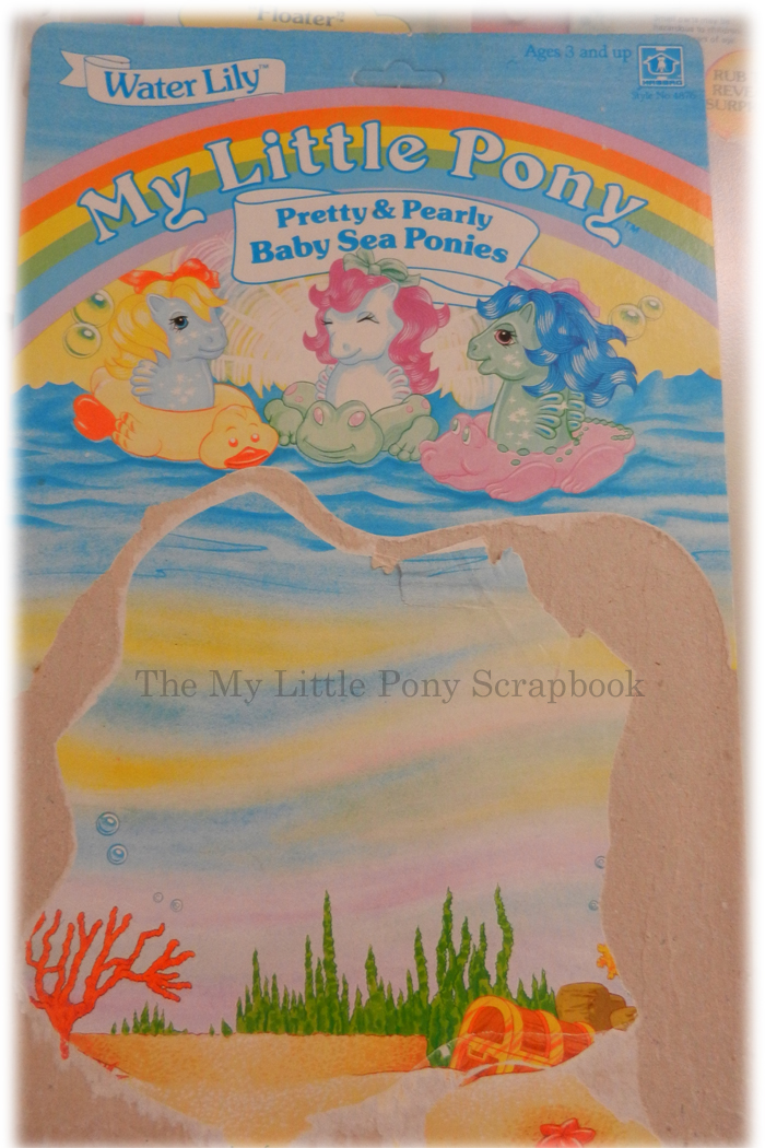 The only pony that was sold both in the North American and UK sets, without amendments, was BEACHCOMBER. All of the other five ponies differed in some way. The other ponies the UK had as Pearly Baby Sea Ponies were Water Lily, Ripple, Sunshower, Sea Star and Tiny Bubbles. They also came on very ornately designed, underwater cards. An example of the card they were sold on can be found below (clicking on the images will open a large size version)