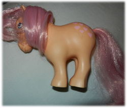 While there shouldn't be a Flat Footed version of Peachy, there is one. She only ever shows up in North America, suggesting she was a very early batch of the character made before the alterations to the pose that led to all later ponies having concave hooves. This version may have been sold with early versions of the Grooming Parlour in North America (under the release Pretty Parlor). It is also possible she came as part of a set with a version of the earlier My Pretty Pony, as one exists with Peachy's colour scheme - although one such set like this did exist involving Butterscotch I do not think this has been confirmed for Peachy. The best assumption at the moment is that she was an early version of the playset pony that was later modified, and that her modification came too early for her to ever be released in the UK.