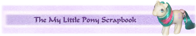 The My Little Pony Scrapbook is a free collector's guide to My Little Pony. The text and research contained herein are not to be reproduced in any other source without permission, including in particular any profit-generating enterprises. This includes published guides to My Little Pony and written permission is required for any inclusion of information or images from this site to be included in any other project.