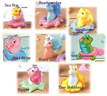 We'll begin with the UK set. Along with Beachcomber, we had the following ponies as Pearly Baby Sea Ponies: Water Lily, Ripple, Sunshower, Sea Star and Tiny Bubbles. The UK set was actually released early in the 1987 line, and continued to be sold throughout 1987 (rather than 1986) but splitting the set would just have complicated matters! The UK set also had puffy stickers.
