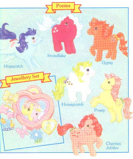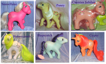 "My Little Pony" this year was the simple collective term for a mish-mash of styles from earlier years rolled into one. The set consisted of six - two old favourites, Posey and Cherries Jubilee were modified and re-released. Cherries Jubilee now had straight hair, and she and Posey both had darker symbols. These reissues joined four brand new ponies whose issues were as complicated as their special features. They retailed for between £2.85 and £2.99 each.