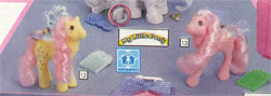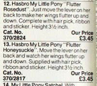 . They are listed in the Argos Catalogue as retailing this year for £3.45 or thereabouts (although Argos did not seem to carry the new characters, and continued selling Honeysuckle and Rosedust into 1987). Argos also mentions a sticker coming with the ponies, although the fact they were selling earlier characters doesn't make this a firm source for the 1987 set. (The existence of flutter stickers from that year, however, does!)