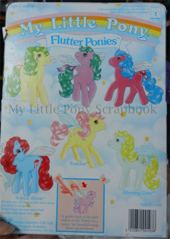It's also worth noting that some of the first-year only Flutter Ponies were released with the new style of wing holder, implying that the stronger design was brought into production half way through 1986 as Hasbro rethought their design. The fact some stores were still retailing Honeysuckle into early 1987 may explain this; it is possible that earlier characters remained in production alongside the new set, whose packaging had been updated to reflect the new ponies.