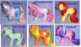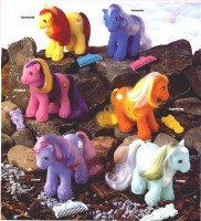Though there are similarities with the brushes and combs between this set and the Adventure Boy Ponies, these six ponies did not come with hats or bandanas. Much as any traditional pony of this time, they had brushes/combs, ribbons and a round puffy sticker. They used the same 'clydesdale' or Shire Horse style poses that the Brother ponies used - with two characters in each pose.