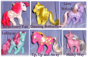 In North America, they were known as "Twice as Fancy Ponies", a label I generally adopt because it encompasses all the ponies sold in this style over two years - the term "Party Pony" only refers directly to these six new characters, and possibly Fifi from the salon (though this was never clearly defined). Some of the set also had different names in the North American release.