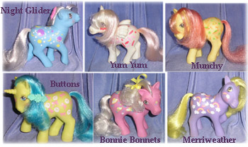 Though classically "Twice as Fancy", with their spread out symbols and repetitions on their cheek or nose, these six characters did break one rule of the original set. The group's only unicorn, Buttons, had a single solid colour mane and did not have the unicorn 'streak'. In some ways, 1988 was a break away from these earlier traditions.