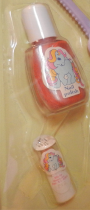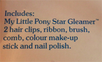 The make up was easily identifiable as belonging to this set, as the labels featured Princess Star Gleamer. All ponies from the set had the same label on their make up, not just Star Gleamer. The make up consisted of nail polish and a 'make up stick' that resembled lipstick.