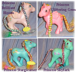 These beautiful newcomers had the same long hair and growing tail mechanism as the original set, although their manes were not rooted as thickly and instead were rooted with coloured tinsel, to emphasise their royal status. Each pony also had a coloured 'gem' on her forehead, to denote her special lineage.