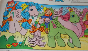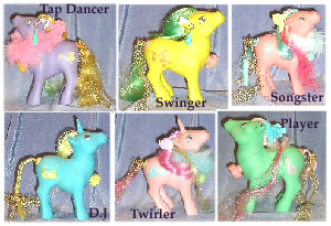 In the UK comics, Player and Songster were always depicted as pegasus ponies and it appears that early plans were to make them this way, since prototype photos have been found of them both in pegasus moulds. However - probably to facilitate the movement - the set eventually only consisted of earth and unicorn ponies, each in the same looking up pose. The pose was based on the early unicorn pose used by Powder and Skyflier, and even the earth pony moulds bore a startling resemblance.