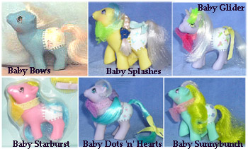 The different manufacturing locations also meant variations in the baby ponies, in particular Baby Splashes and Baby Starburst. See each individual page for more on this.