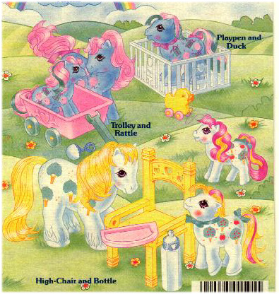 The Loving Family Ponies also had a group of accessories which were specifically designed for their use. They were baby pony accessories, sold under the unoriginal labels "Playpen and duck", "High chair and bottle" and "trolley and rattle." Each playset was sold on a seperate card, with the Loving Family Pony graphics on. I don't believe these sets were sold in North America.