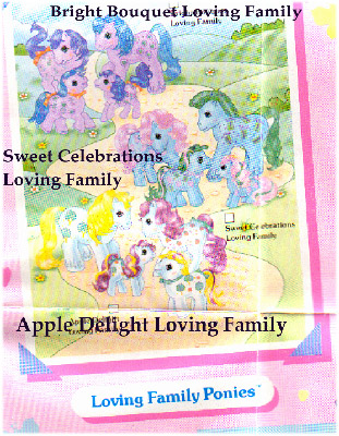 Bringing with them a brief introduction to the concept of genetics, the Loving Family Ponies first came onto the scene in 1989. Although Hasbro had tried mother and baby ponies that matched in earlier years, this was the first foray into the world of My Little Pony families and each set consisted of a mother, a father, and two children (the happy nuclear family!). Each baby bore the same body tone as the adults, but combined both mother and father's symbols and hair colours.