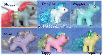 The set included one unicorn, one pegasus and four earth ponies. Each was issued with curly hair, though often second hand they are found with the curls washed or brushed out of them!