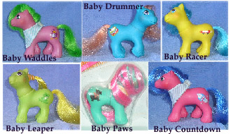 The Playtime Baby Brother Ponies consisted of six new boy baby characters, each with clydesdale hooves and freckles across their noses. Each one was sold with a striped bandana (and some of mine are wearing these on their pages) among other accessories. However, only Baby Paws and Baby Drummer were sold in the UK. They were released as part of a set called the Playtime Baby Ponies, which also incorporated four of the six Fancy Pants Baby Ponies (more on them on their own page!)
