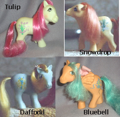 The set comprised four ponies, one of which was a pegasus. There were no unicorn ponies in this set, and the one pegasus that there was did not have some of the classic pegasus features of earlier years (such as a streak in her mane or a glittered symbol). As their name suggests, each pony was flower themed, with a bouquet symbol representing different types of flowers. They were sold with flower picks (monocolour) in the style of the Flutter Ponies' combs, but no other accessories.