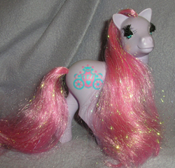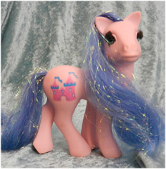 I honestly have never understood what Hasbro were thinking when they released these two ponies. I admit, I am not a fan of this pose, used mainly for the two Bridal ponies, and the addition of very obviously fake eyelashes did not, for me, do it any favours. These two ponies, however, were apparently Princesses. They originally came in curved boxes, with shiny accessories such as a glittering short cape. They also had tinsel in their hair - of the same clear rainbow style as that found in the two Bridal pony releases.