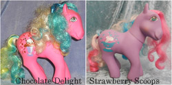 They were sold with their hair in ringlets, similar to the Rainbow Curl Ponies or Candy Cane Ponies, but in three distinct colours. The curls are often messed up on loose ponies.
