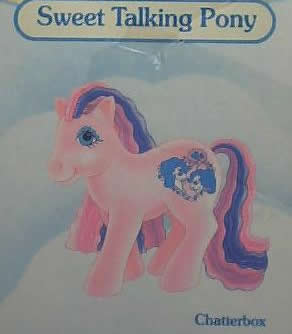 There are some prototype insert images of this set with closed mouths, but the actual sold ponies had open mouths. Their poses matched some of the Pocket Friends Ponies. On one UK insert, only Chatterbox is shown, but both ponies were sold in the UK. They were also initially marketed just as "Talking Ponies", but when it came to release, they were labelled "Sweet Talking Ponies" on the package.In the UK they were sold in bordered boxes, as per the style for the year, whereas in the North American release I believe they were sold on card.