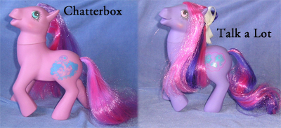 In the UK pony comic, Chatterbox and Talk a Lot were represented rather in the light of flappy ponies who rarely shut up and who sometimes caused problems with that fact. The ponies themselves, however, could only say three phrases apiece. In the English release, the ponies say the following: