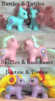 More Teeny Tiny Ponies, this time in twin format. Many recycled names, too - with only 'Bootsie' being new from all of the set and two sets of twins named after Newborn Twins from earlier years. This set explains the reason why Teeny Weeny (or in the States, Teeny Tiny) ponies had numbers on their hooves - each set of twins was identical except for the pose and each pose had a number. It is not the only way to tell twins apart, however, for each pony has a tiny "birth mark" type miniature symbol somewhere on their body (cheek or leg, depending on the twin!).