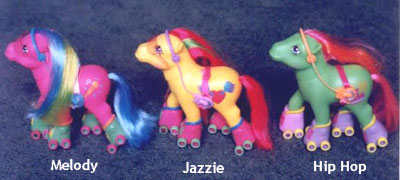 All sold in the same 'walking pose', the Rollerskates Ponies were probably the runners up in this year's contest for most gimmicky My Little Pony. (You can see how far things have come from the early 1980s, since these girls were fitted out with not only rollerskates but CD walkman systems to allow them to listen to their favourite tunes while they rolled!)