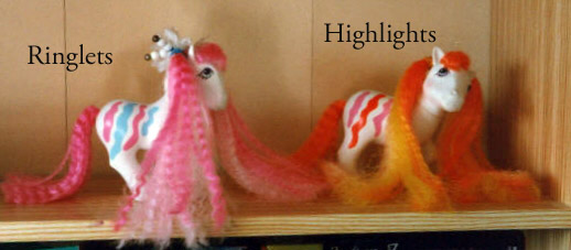 These manes were of three colours - Highlights' being orange,yellow and beige, Ringlets' being dark pink, light pink and white - but strangely their tails were very short and only of one colour. The hair was also crimped and as a symbol each pony had coloured squiggles across her back. Each of them came with a bow hairtie with attached ribbons, and a small bow hairclip, plus a shooting star comb. This was quite an array of accessories for 1994, when most ponies came with an accessory OR a comb, as opposed to both.