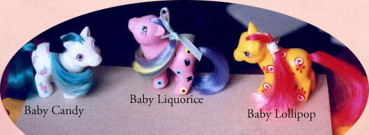 Each baby pony came with a hair clip which was miles too big for the baby pony, and was intended to be worn by the pony's new "mummy" instead.Baby Candy's clip was two yellow sweets, Baby Liquorice had, logically, Liquorice Allsorts in blue, and Baby Lollipop, also logically, had a pink lollipop in a similar style to those smaller clips favoured by the Candy Cane ponies. The card actually shows Lollipop sketched with hers in her hair, but from the photo on the corner, you can see that, really, it's almost as big as her! The clips are extremely hard to find on the second hand market, because they easily get mixed up in doll or hair accessories.