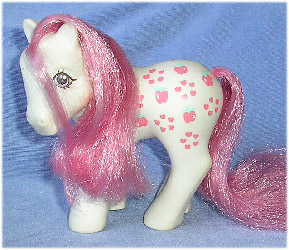 MUMMY: White earth pony with pale red mane and tail, red apples symbol all across body.