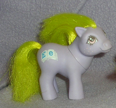 Purple earth baby pony with yellow mane and tail, white book printed with E e symbol