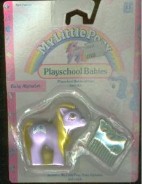 Baby Alphabet did not have any confusion over her name, but, to make up for it, she had a lot of confusion regarding her pose and her symbol. The prototype shows her in the scarcely used Baby Tiddly Winks pose, but the real pony was sold in the more common Baby Ember pose, with the head turned to the side - another favourite of Hasbro UK/Intl. Why her symbol was changed from a logical a b to a weird E e is completely unknown, but nonetheless, this is what happened.