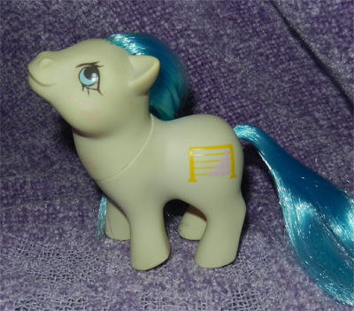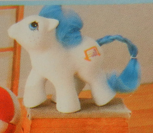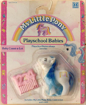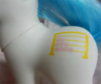 There is a variation on Baby Count-a-lot, which seems to be either a production error or batch related. Most Baby Count-a-lots have their symbols in the same way as the pony pictured above, with the beads on the abacus towards the pony's tail. This is also shown in the prototype image. A small number (it is not clear how many batches) of Baby Count-a-lots have their symbols the other way around, with the beads closer to the mane of the pony than the tail. These appear to show up more often in continental Europe but it is not a guarantee (I got mine from the UK, so there doesn't seem to be a hard and fast rule). All that is known about this variation is that it is considerably more uncommon than the version with the beads towards the mane.