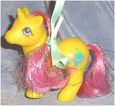 She is also one of the few yellow baby unicorn ponies that Hasbro made. I believe she is also the *only* Baby Unicorn Pony to have tinselled hair of any form.