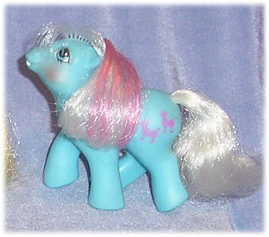 Baby Fifi confuses me. Her mother, "Fifi", the So Soft Pony, was a unicorn with a decidedly aqua body tone. Baby Fifi, however, is blatantly blue - and despite having kept her mother's unicorn streak in her hair, she has no horn of her own. Pony genetics gone a bit mad there, I think!