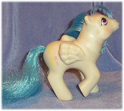 Baby Graffiti was the pegasus baby from the set and though none of the Peek-a-Boo Baby Ponies appear to be hard to find second hand, it is often difficult to find this one without significant discolouration to her body.