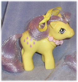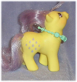 According to the Argos Catalogue, Baby Lemon Drop was also sold with a teddy brush, a nappy and a rainbow striped "travel rug". I have never had this pony mint in package, so I do not know how accurate the catalogue photo is for her accessories.