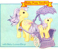 The second edition of the delicate stroller was sold with a new Baby Pony character based on one of the much loved early adults - Lemon Drop. Her stroller, like that belonging to 1985, matched the baby pony with which it was sold, for it was in lavender this year. It is also more difficult to find on the second hand market than the original stroller, especially unfaded and undamaged.