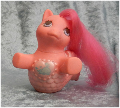 Peach baby merpony with dark pink mane, pearly tail, blue whale symbol on chest.