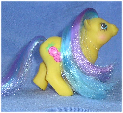 Yellow baby earth pony (with unpainted first tooth), purple and blue mane and tail, two pink pineapples with green spikes symbol.