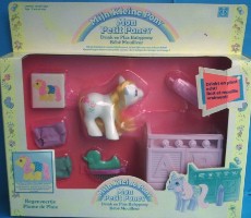Yet another victim in the US of Hasbro's Recycled Name Syndrome, this baby pony was known as Baby Cuddles stateside. (Seriously, weren't there enough ponies with that name already by this point?). She did make one fleeting comic appearance that I remember, which had some connection to growing flowers, I think, but her character was in general eclipsed by the more popular Wellyboot and Flicker.