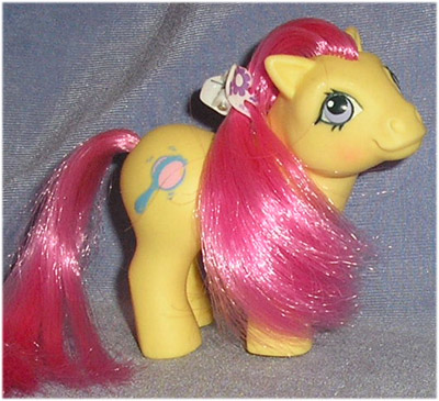 Yellow baby earth pony with dark pink mane and tail,pink and blue rattle symbol