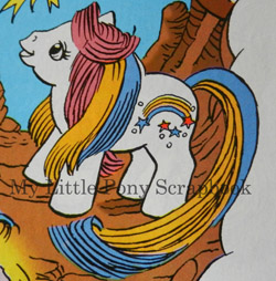 Baby Starbow continues to confuse everyone with her two tone hair issue. Like the Rockin' Beat Pony, Pretty Beat, from the same year, she could be sold with either a DARK PURPLE or BLUE stripe in her hair. The one pictured at the top of the page is often referred to as the 'German' version, but she is actually the mainstream European version, including here in the UK. The pony pictured above is my sister's childhood pony which she bought here!
