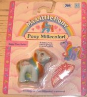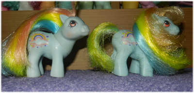 Baby Sunribbon is actually the prettiest pony in the set in my opinion. Although she does not have a colour variation as such, there are versions of her with the silkier straight hair that is seen on Blue Hair baby Starbow, making me think that it's possible this set have a first and second edition release as well. My Baby Sunribbon is the only one from the set I bought second hand, but she came from a sale here in the UK. Her hair is a mix of straight and curly, like my sister's store bought Starbow and my Rain Ribbon, which makes me think she belongs with them in terms of origin/release. The one in the MOC picture, however, looks to have straight hair at the front, so it's hard to know for sure.