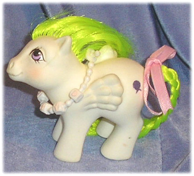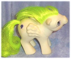 The Fact file is cute on the subject of this baby, however. According to the entry, she used 'baby magic' to make balloons and these balloons helped her to fly (well, baby wings are only tiny!). I thought that was kinda neat, but I can't remember it ever being actually used in a comic story. She also had a brief part in Escape From Catrina, when Megan is putting the Baby Ponies to bed!