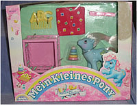 The only Nesthäckchen Baby to be shown correctly on the advertising insert, Baby Würfelchen's name translates I believe as Baby Little Cubes into English. It's worth noting that her hair is meant to be pale pink, as you can see from my mint in package image above - and any with white hair have faded (this is not a variation).