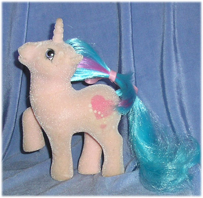 Bangles was the only unicorn to be produced for the final set of So Soft Ponies, and she featured the new unicorn pose for 1987, with an open mouth. (Yes, they did flock the inside of her mouth!) She is probably one of the more common So Softs from her set, probably on account of her being pink.