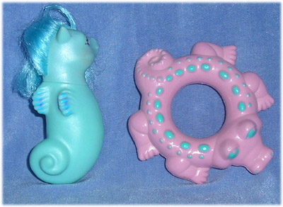 Aqua pearlised baby sea pony with blue mane, pinkish purple and aqua crocodile (or alligator) float.