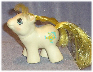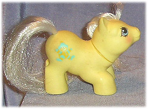TOPPY: Yellow newborn earth pony with white mane and tail, aqua and yellow clown symbol.