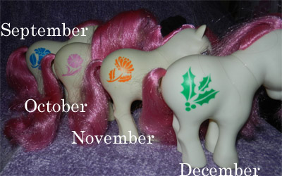 The Birthflower Ponies were an experiment in 1980s pony cloning. I mean that quite literally, as - at least in the mail order release - all of them were the same pose and colour scheme, with the only differences being their symbols. Each pony had a symbol corresponding to the flower for their month, and they are often known by the names of their flowers as well as by their months.