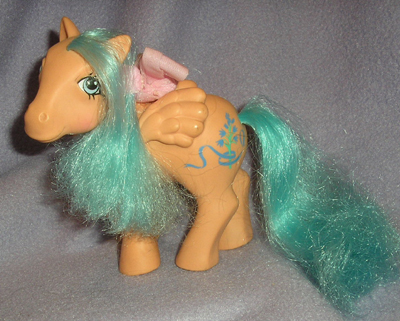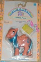 This is Bluebell, the only pegasus from the set. She was sold in a pose that was originally used in 1985 with ponies such as Surprise and Heart Throb. 1990 was actually a great year for the recycling of older poses, as this pegasus pony pose saw the light of day for the first time in a long time in releases such as this and the Rainbow Curl Ponies.