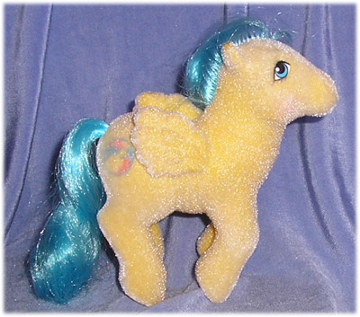 Bouncy was the first pegasus pony to encompass this colour scheme -although definitely not the last. Logically, her name, 'Bouncy', was an allusion to the ball symbol, making her fairly straight-forward a pony to recognise and identify! There was never a version of her without flocking.